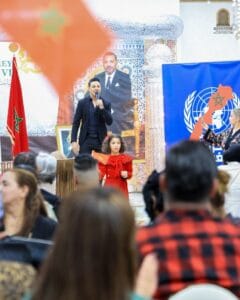 وقد صدحت القاعة بأغانٍ وطنية شهيرة مثل “نداء الحسن” و**”العيون عينيا”**، في لحظات استرجعت فيها الجالية ذكريات المسيرة الخضراء، وسط تفاعل حار وتصفيقات متواصلة من الحضور.